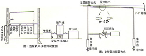 (3) 支線管路必須從主管路的頂端接出,以避免主管路中的凝結(jié)水下流至工作機(jī)械中或者回流至空壓機(jī)中。