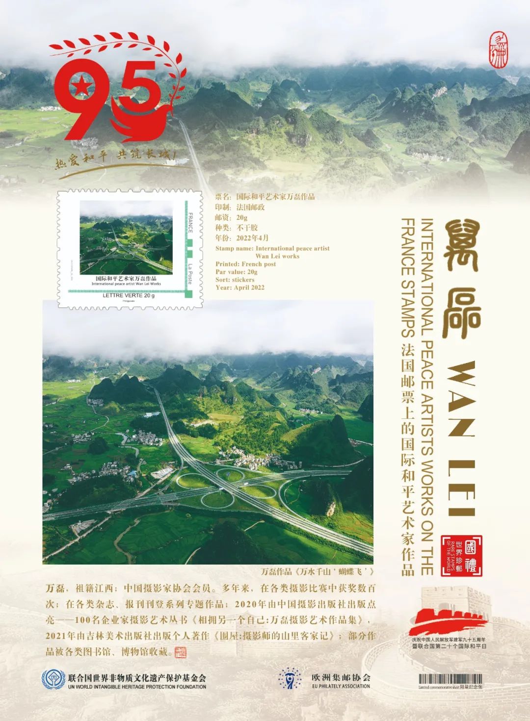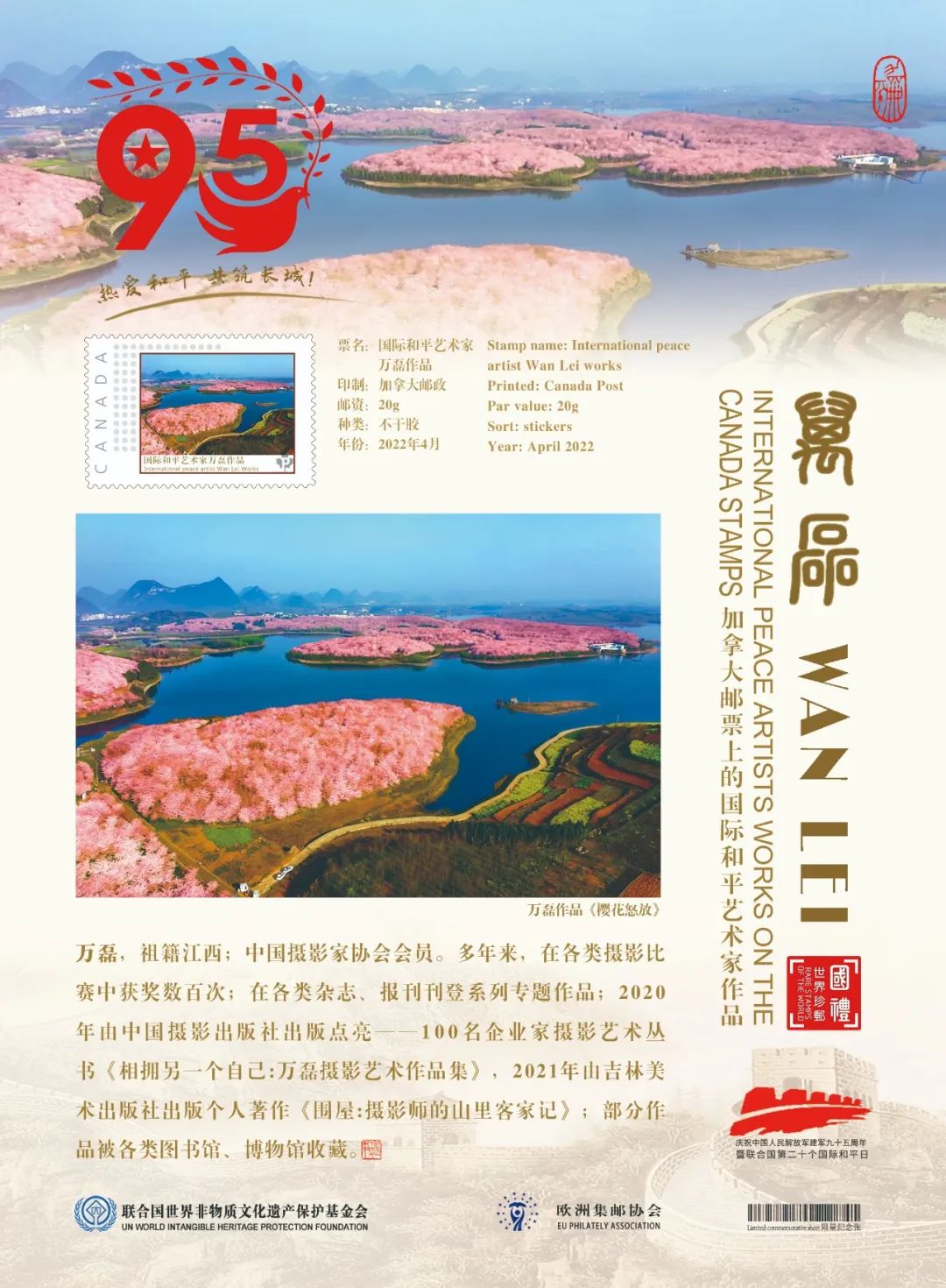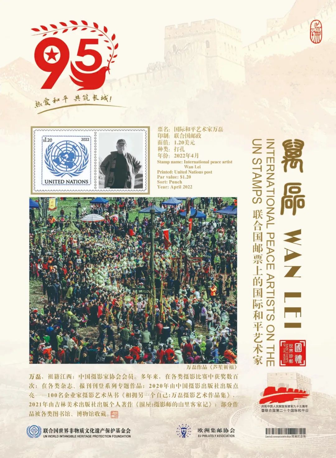 鑒于萬磊在中國攝影藝術(shù)上的杰出成就和為國際文化交流所做出的卓越貢獻(xiàn),業(yè)經(jīng)中國國際文化藝術(shù)發(fā)展交流中心、歐洲集郵協(xié)會、山水丹青國際藝術(shù)中心、藝術(shù)財(cái)經(jīng)雜志等國際權(quán)威機(jī)構(gòu)組織推薦,萬磊被聯(lián)合國世界非物質(zhì)文化遺產(chǎn)保護(hù)基金會授予“國際和平藝術(shù)家”榮譽(yù)稱號。這不僅是對中國藝術(shù)家杰出成就的肯定和贊譽(yù),也是對世界和平的深切呼喚!