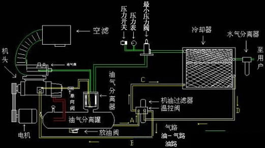 油的循環(huán)過(guò)程可以理解為兩路,即機(jī)頭至油氣分離罐至油氣分離器至單向閥至機(jī)頭;而另一油路又可分為兩個(gè)過(guò)程,即機(jī)頭至油氣分離罐至溫控閥至機(jī)油過(guò)濾器至機(jī)頭,當(dāng)溫度超過(guò)溫控閥感溫元件動(dòng)作值時(shí)(一般為71℃時(shí)動(dòng)作)油路循環(huán)過(guò)程為:機(jī)頭至油氣分離罐至溫控閥至油冷卻器至溫控閥(匯合)至機(jī)油過(guò)濾器至機(jī)頭。