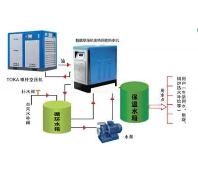 螺桿空壓機(jī)余熱回收機(jī)在工廠正常上班時(shí),供應(yīng)熱水連接在空壓機(jī)冷卻系統(tǒng)。螺桿空壓機(jī)在正常使用時(shí),不需要任何能源消耗,即連續(xù)制造產(chǎn)生熱水。